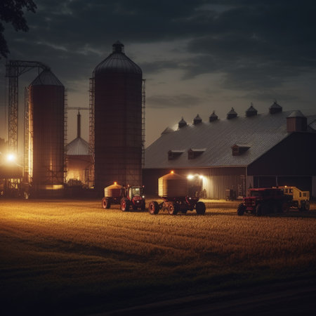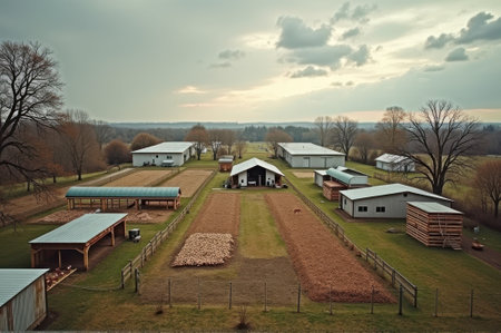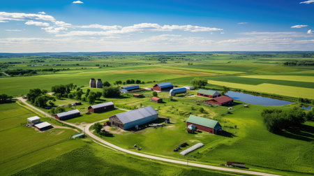 Aerial view of peaceful farmstead with barns and fields at sunset. That the image is generated using AI.