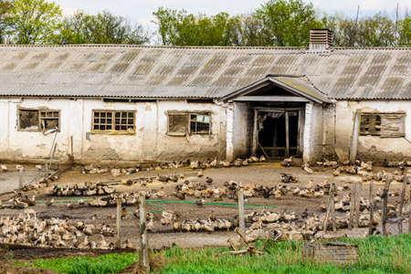 Flock of ducks at farmyard. Farming concept