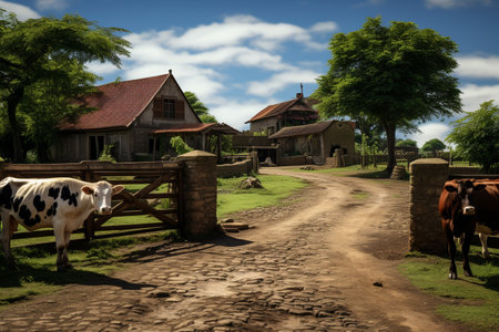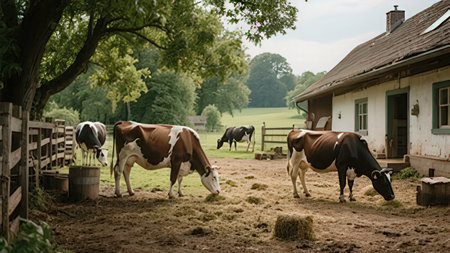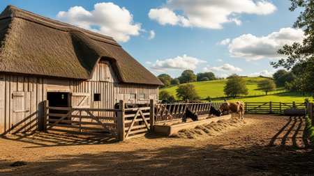 Rural barn scene with cows feeding in scenic countryside landscape