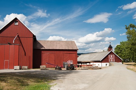 backyard of red farm buildings under blue sky, Hamar, Hedmark, Norway
