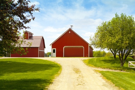 scenic dirt road between rustic barns on a beautiful farm