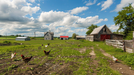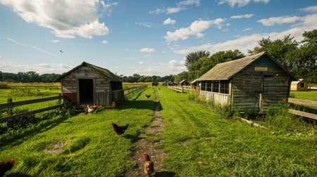 Rural farm landscape with free-range chickens roaming between rustic wooden barns. That the image is generated using AI.
