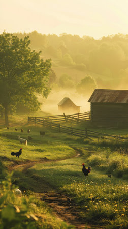As dawn breaks over the farm, roosters crow in the crisp air, adding to the serene ambiance created by the morning mist and lush landscape.