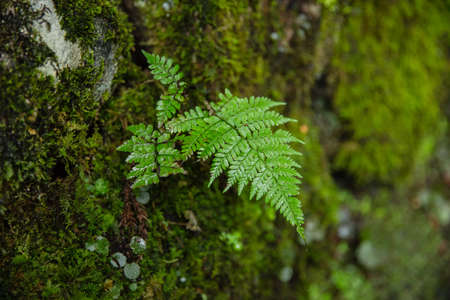 Tropical green leaf with a dark shade. in the shade of a forest fern. the background is blurred. minimum focus point