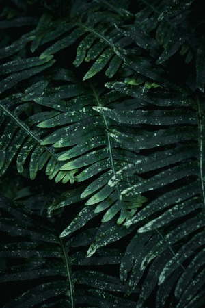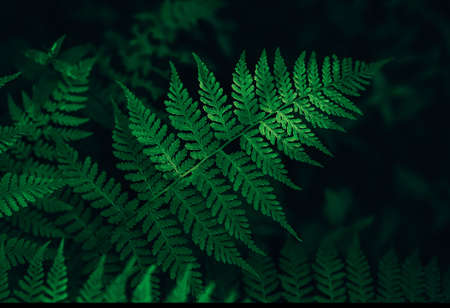 Fern leaves on dark background in jungle. Dense dark green fern leaves in garden at night. Nature abstract background. Fern at tropical forest. Exotic plant. Beautiful dark green fern leaf texture.