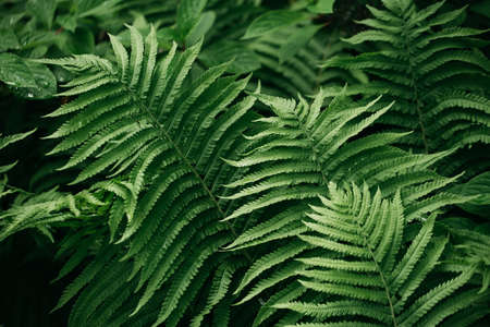 Rich green background with ferns. Beautiful green fern in the summer forest. Natural landscapes of forests