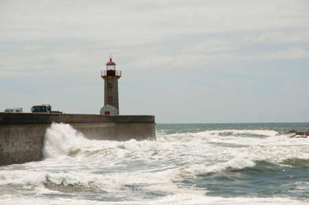 the Lighttower by wind and storm at the beachfront on the coast in the city centre of Porto in Porugal in Europe. Portugal, Porto, April, 2019