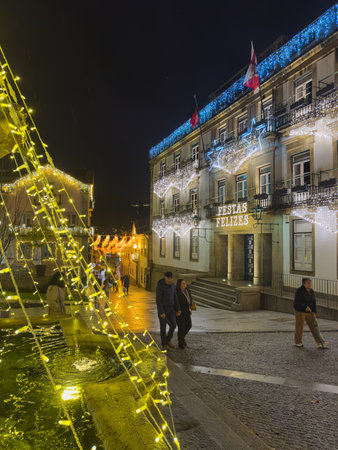 Santa Maria da Feira, Portugal - December 6, 2025. Christmas lights illuminate a festive street in Santa Maria da Feira, Portugal, with a Festas Felizes sign on a stately City Hall building.