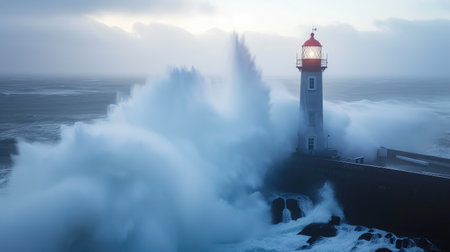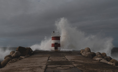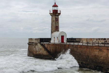 A dramatic portrayal of resilience depicts the iconic Porto lighthouse braving an epic Atlantic storm