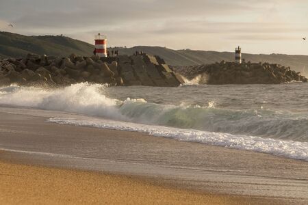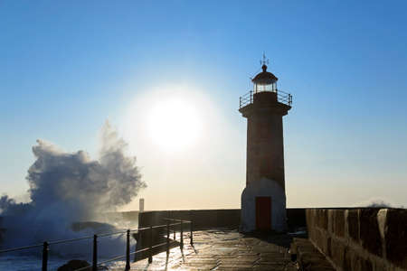 Wave on the lighthouse in the background on the sunset. Atlantic, Porto, Portugal.