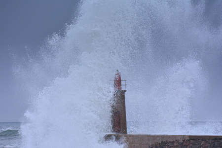 Stormy wave over old lighthouse and pier of Viavelez in Asturias, Spain.