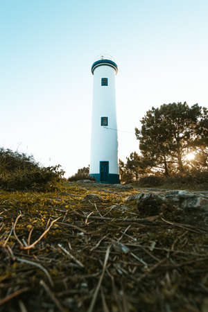 A beautiful white and blue lighthouse during a sunny bright day in the spanish coast