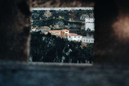 View of houses through wall on cliffside next to the Douro in Porto, Portugal
