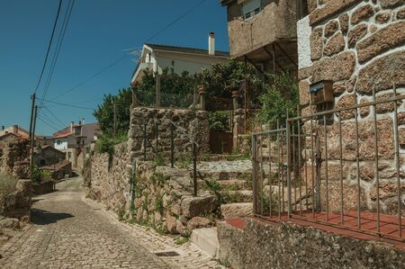 Deserted alley and charming old house with stone staircase and iron railing, in a sunny day at Belmonte. A cute small town, birthplace of the navigator Pedro Alvares Cabral, on eastern Portugal.