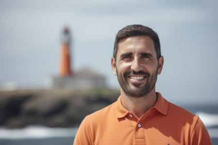 Portrait of smiling man standing in front of lighthouse on the beach