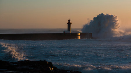 Wave splash at sunset near lighthouse, Porto, Portugal
