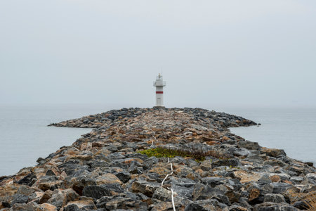 Lighthouse on a rock in a foggy day at the beach