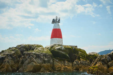 Old Muglins Lighthouse on the isolated island the backdrop of the blue cloudy sky.
