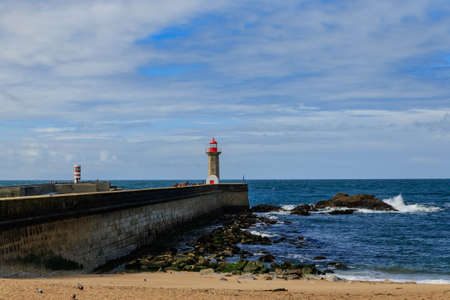 Felgueiras Lighthouse on a breakwater of Foz do Douro district of Porto city, second largest city in Portugal.