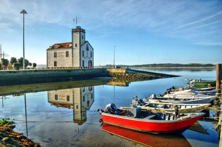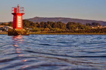 Small lighthouse with calm water in Ria de Arousa with some bird on it