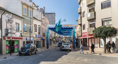Ovar, Portugal - February 18, 2020: architectural detail of the typical houses of the city decorated for the carnival where people are walking on a winter day