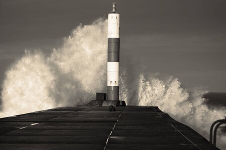 Wave breaking on jetty and beacon during storm at Aberystwyth in Wales. With colour toning
