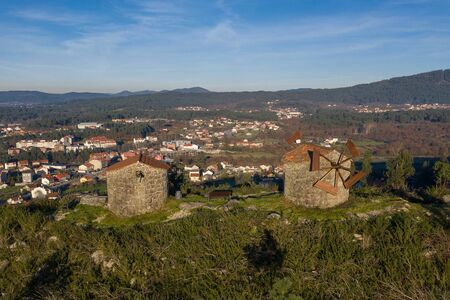 old stone windmill on a hill in the light of sunset, Galicia, Spain