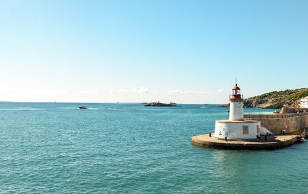 Lighthouse on the sea against blue sky and blue ocean surface