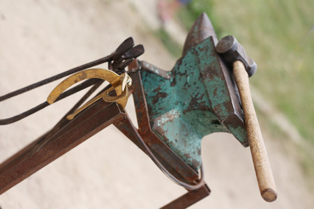 Farrier tools close up view at rural horse farm. Equestrian background. Equipment and hammer rest on the old anvil.