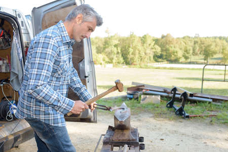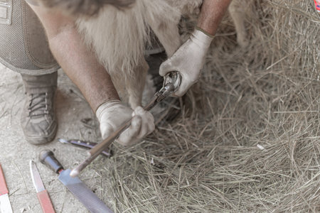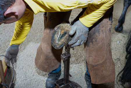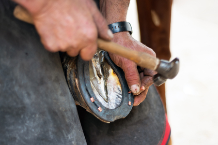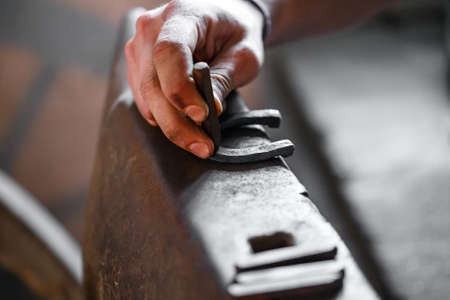 A closeup shot of a farmer fixing and polishing a horseshoe