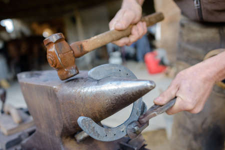 Blacksmith forging a horseshoe with a hammer on anvil at the workshop. Man working with hot red metal.
