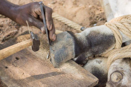 Chettinad, India - October 16, 2013: Blacksmith near Namunasamudran cleans buffalo foot. Action photo, focus on hands blacksmith and feet of animal.