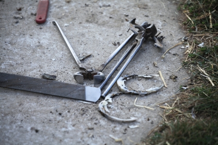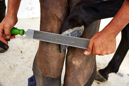 Filing the hoof to level the horse's hoof, farrier working