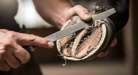 A close-up view of a farrier's hands using a metal rasp to file and shape a horse's hoof. The shavings from the hoof are visible, emphasizing the detailed manual work involved in equine hoof care and maintenance.