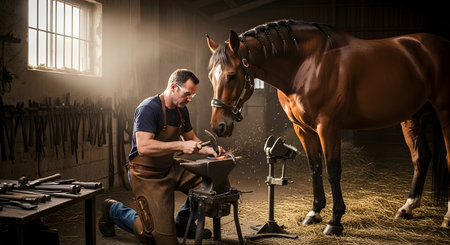 In a rustic, sunlit barn, a skilled farrier wearing a leather apron kneels to forge a glowing hot horseshoe on an anvil with a hammer. A calm brown horse stands patiently beside him, watching the traditional process of equine care and craftsmanship.