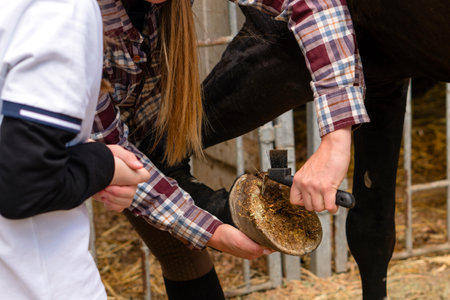 The assistant hold horse leg for hoof clearing. Routine on horse farm.