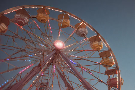 A close-up shot captures a portion of a Ferris wheel illuminated with various colored lights. The metal structure contrasts against a clear, slightly faded blue sky. The composition emphasizes radial symmetry, with a soft, warm color palette. This image is suitable for a range of commercial and editorial applications.