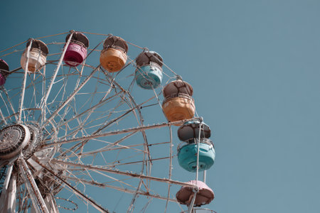 Vintage Ferris wheel under bright blue sky