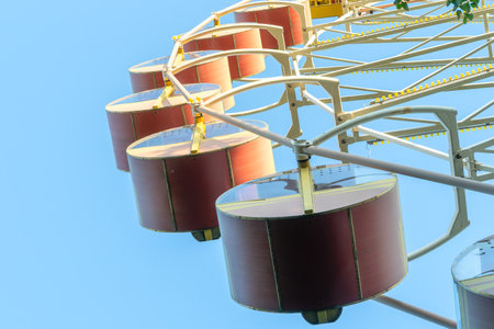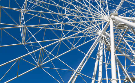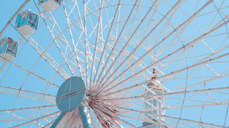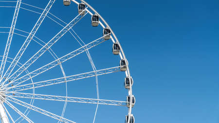 Abu Dhabi, United Arab Emirates - February 2022: Close-up details of ferris wheel on clear blue sky background, with metal beam guides and passenger booths. Marina Mall ferris wheel