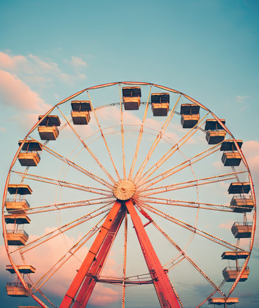 A stunning view of a giant Ferris wheel featuring bright red cabins against a blue sky with fluffy clouds, embodying the spirit of summer fun and joy at amusement parks.