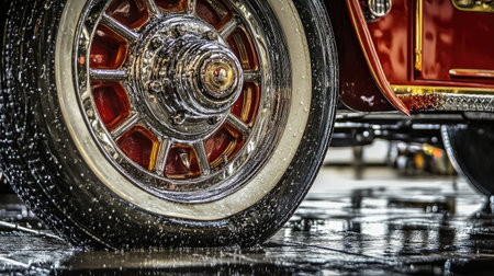 Industrial feel of fire truck wheel against shiny sidewalk, chrome details enhanced by rain
