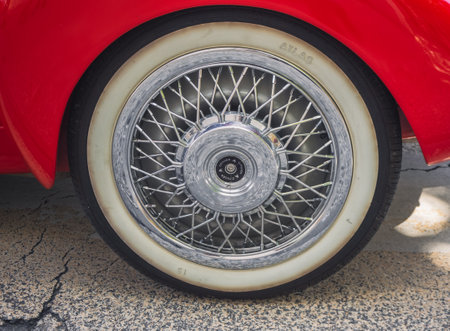 Close up of a chrome spoke wheel hub cap on a classic car