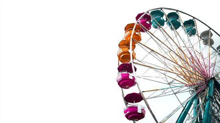A close-up view of a Ferris wheel displays brightly colored passenger cabins. The metal structure contrasts with the clear blue sky. The composition emphasizes the repetitive forms and radial symmetry of the wheel, possibly suitable for promotional materials or editorial content.
