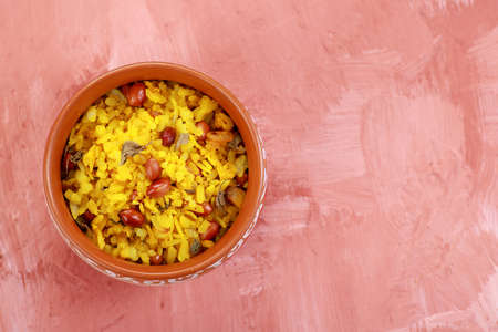 Indian Food Maharashtra Poha with Peanuts in a Pottery Bowl. Top View.