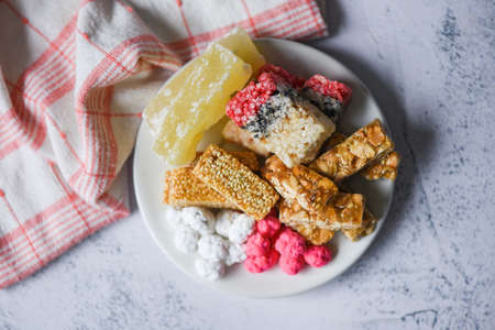 Chinese desserts, Snack mix nuts candies sweets sugar sliced nuts sesame seeds coated beans grains puffed rice candied winter melon, Thai and chinese pay respect to god in chinese new year festival