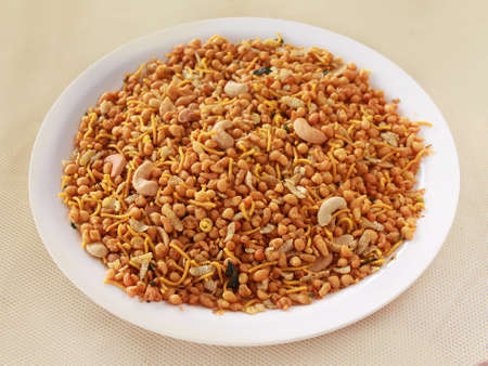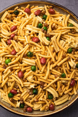 Indian Snacks: Traditional Indian deep fried salty dish called chivda or mixture or farsan made of gram flour and mixed with dry fruits and roasted nuts with salt, pepper, pulses, spice and green peas