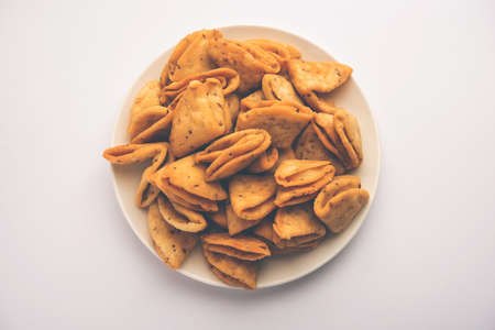 Indian Namkeen palak or Methi Mathri Triangle shape or Tikona - Salted Fenugreek or spinach leaves mixed Crackers