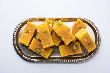 Mysore pak is an Indian sweet prepared in ghee. It originated in the city of Mysuru