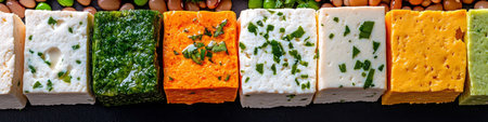 Vibrant and colorful display features various types of textured tofu cubes in unique shades set against a backdrop of beans and greens, showcasing culinary artistry and creativity.