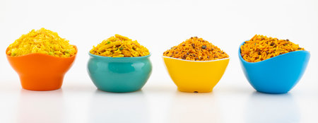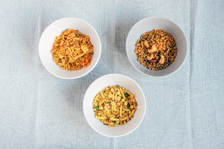 Indian Delicious And Crunchy Mix Namkeen Food Also Know As Mixture, Chivda, Farsan, Namkin, Nimco or Nimko Made of Gram Flour And Mixed With Dry Fruits
